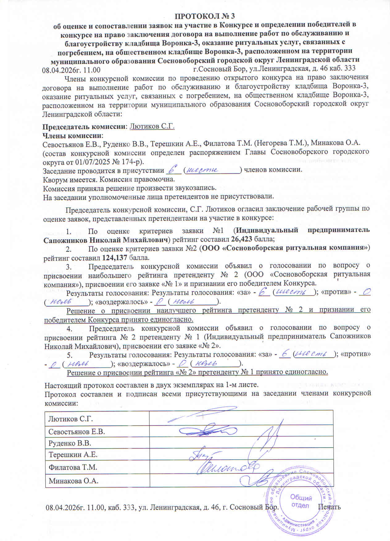 об оценке и сопоставлении заявок на участие в Конкурсе и определении победителей в конкурсе на право заключения договора на выполнение работ по обслуживанию и благоустройству кладбища Воронка-3, оказание ритуальных услуг, связанных с погребением, на общественном кладбище Воронка-3, расположенном на территории муниципального образования Сосновоборский городской округ Ленинградской области